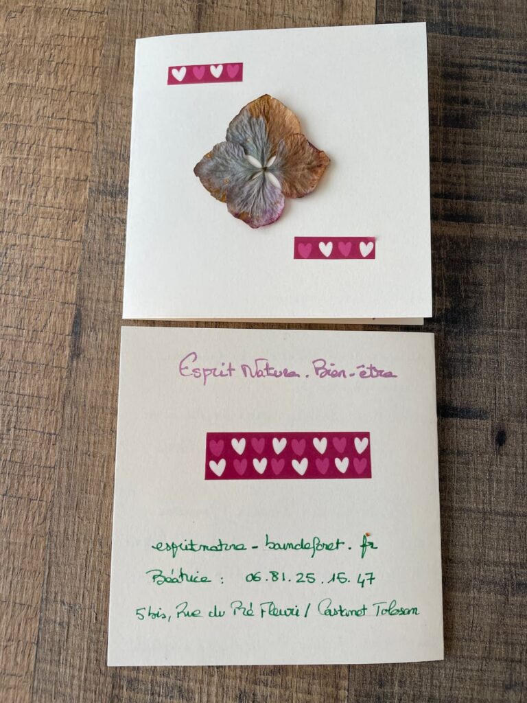 Cette carte cadeau, à été crée avec amour, ornée de fleurs d’hortensia séchées.